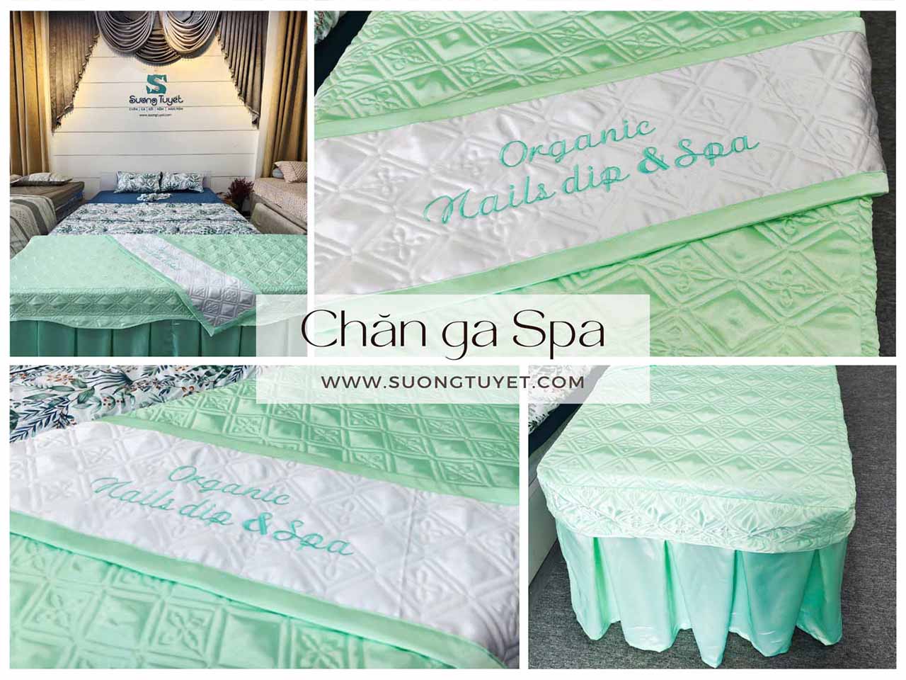 Bộ ga phủ chần Spa màu xanh ngọc hiện đại cho Organic Nail dip & Spa.