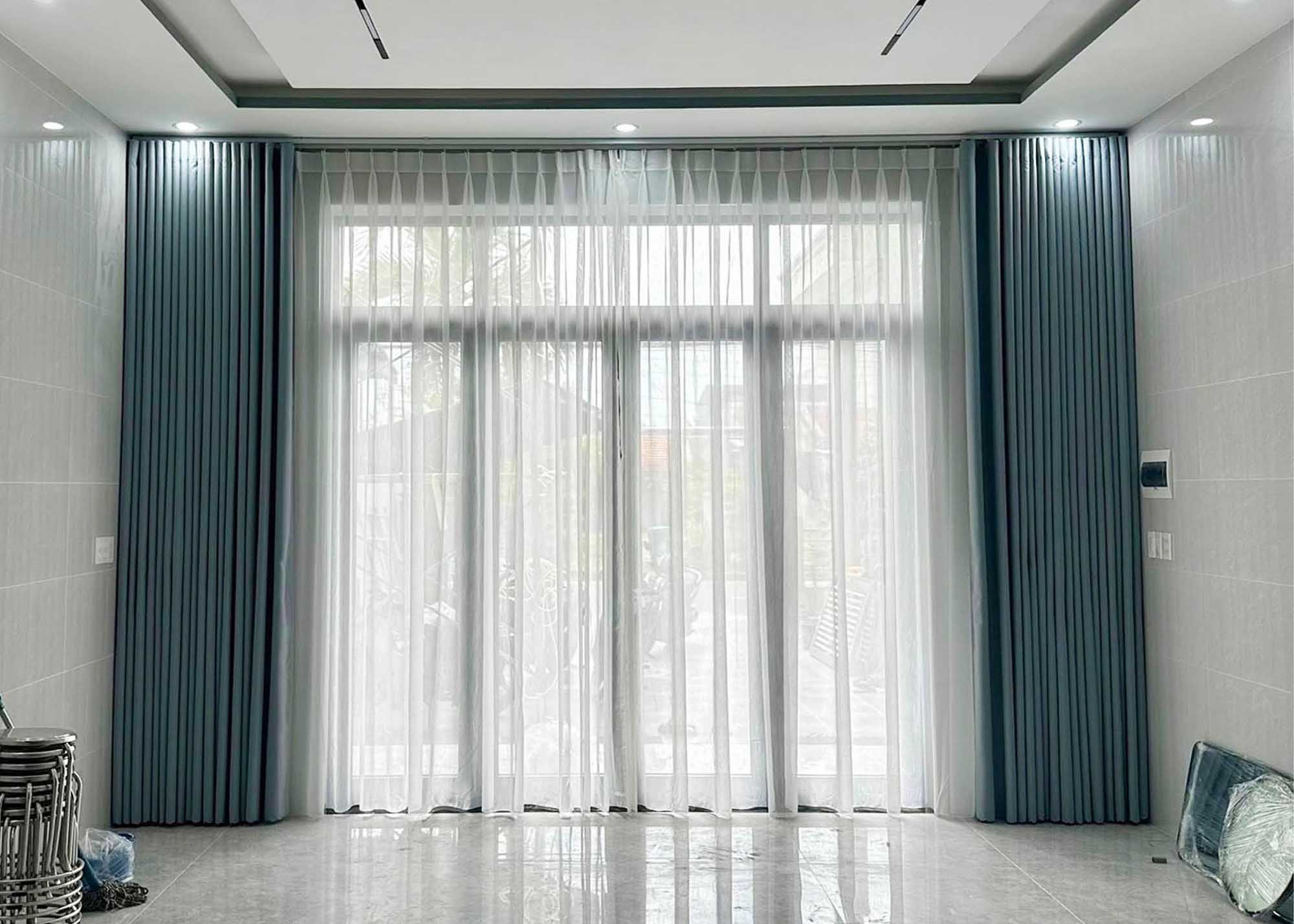 - Phong cách Hiện Đại (Modern): Rèm xanh ghi trơn, không hoa văn, kết hợp với các thanh treo tối giản (màu trắng, đen hoặc bạc) sẽ làm nổi bật vẻ đẹp tinh tế của không gian.