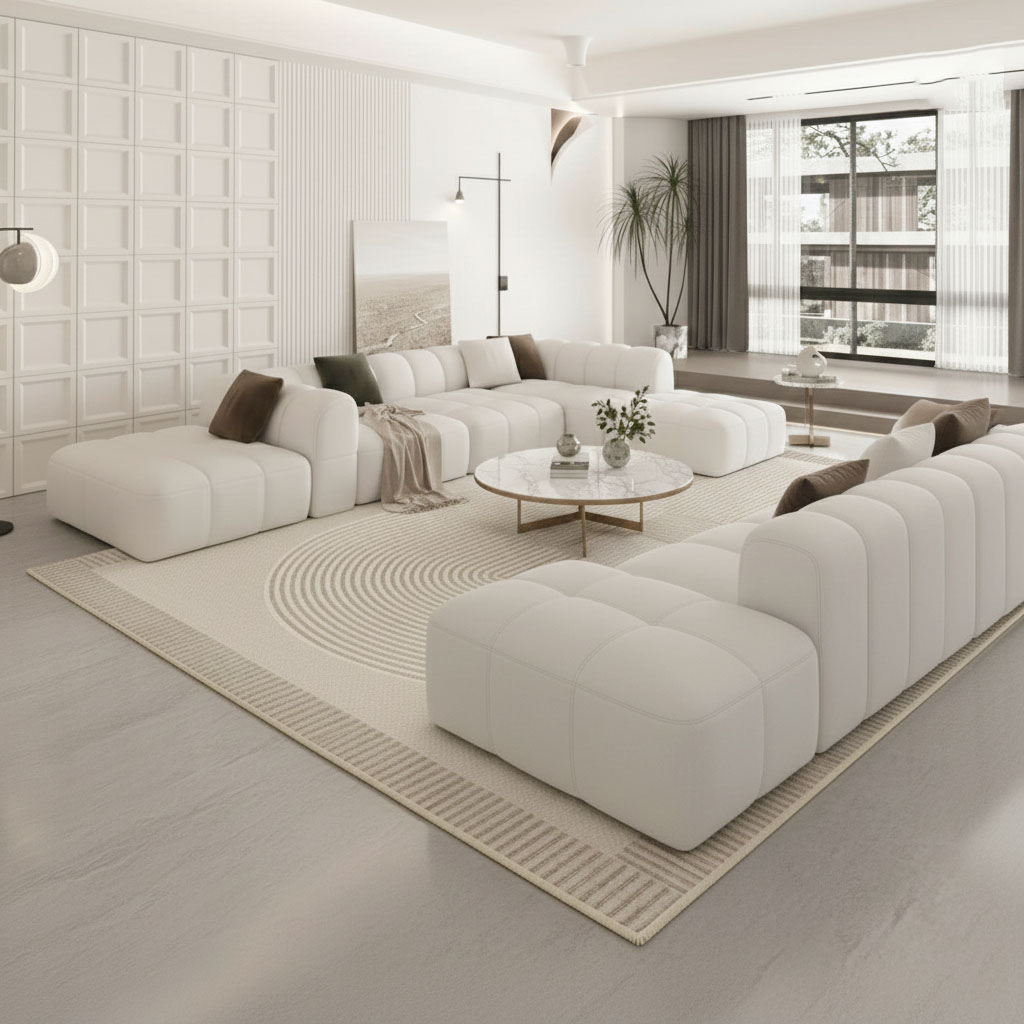 Tấm thảm được đặt dưới sofa để ngồi cho sạch sẽ và cố định.
