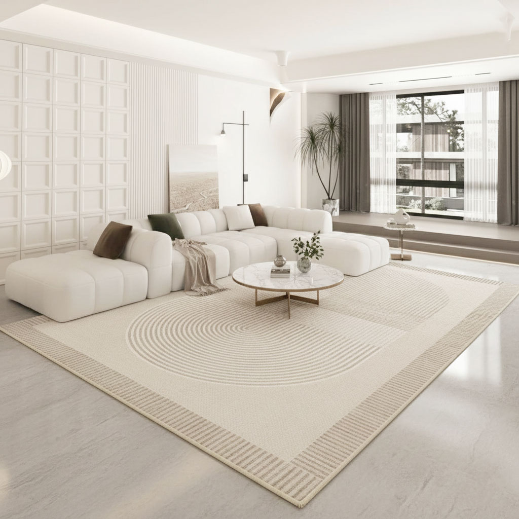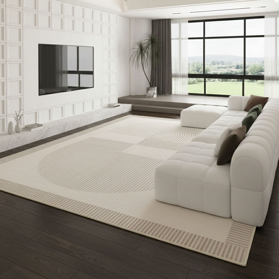 Chất liệu sợi Polyester có độ đàn hồi cao, giúp thảm giữ form tốt, không bị biến dạng dưới sức nặng của bàn trà hay sofa gỗ.